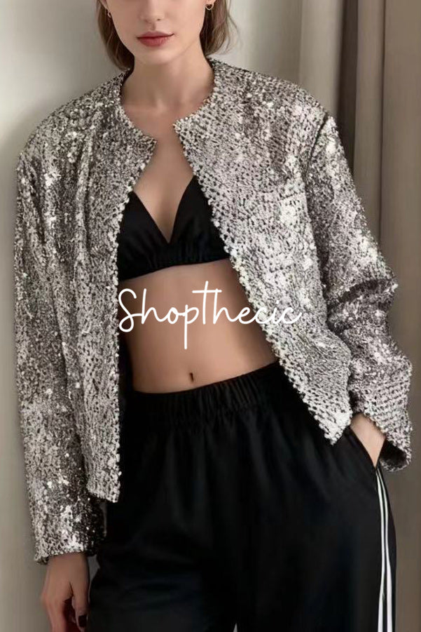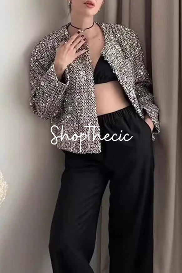 Round neck solid color sequined tweed short jacket$69.00 USD$90.00 USD